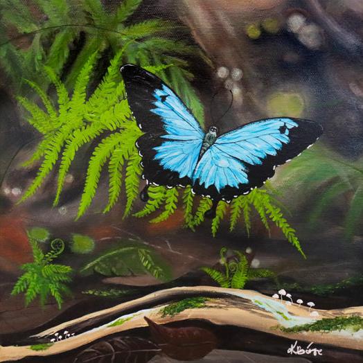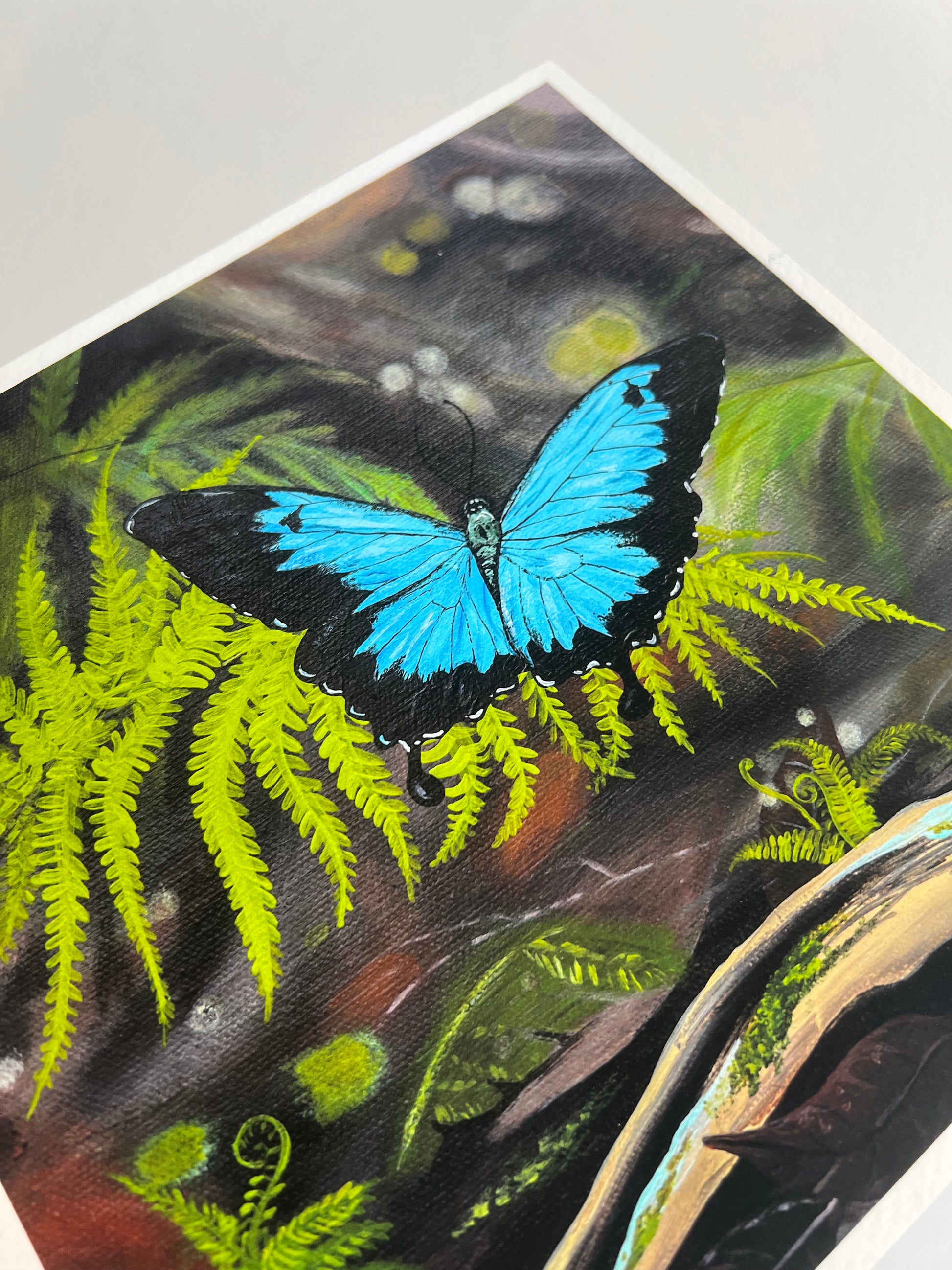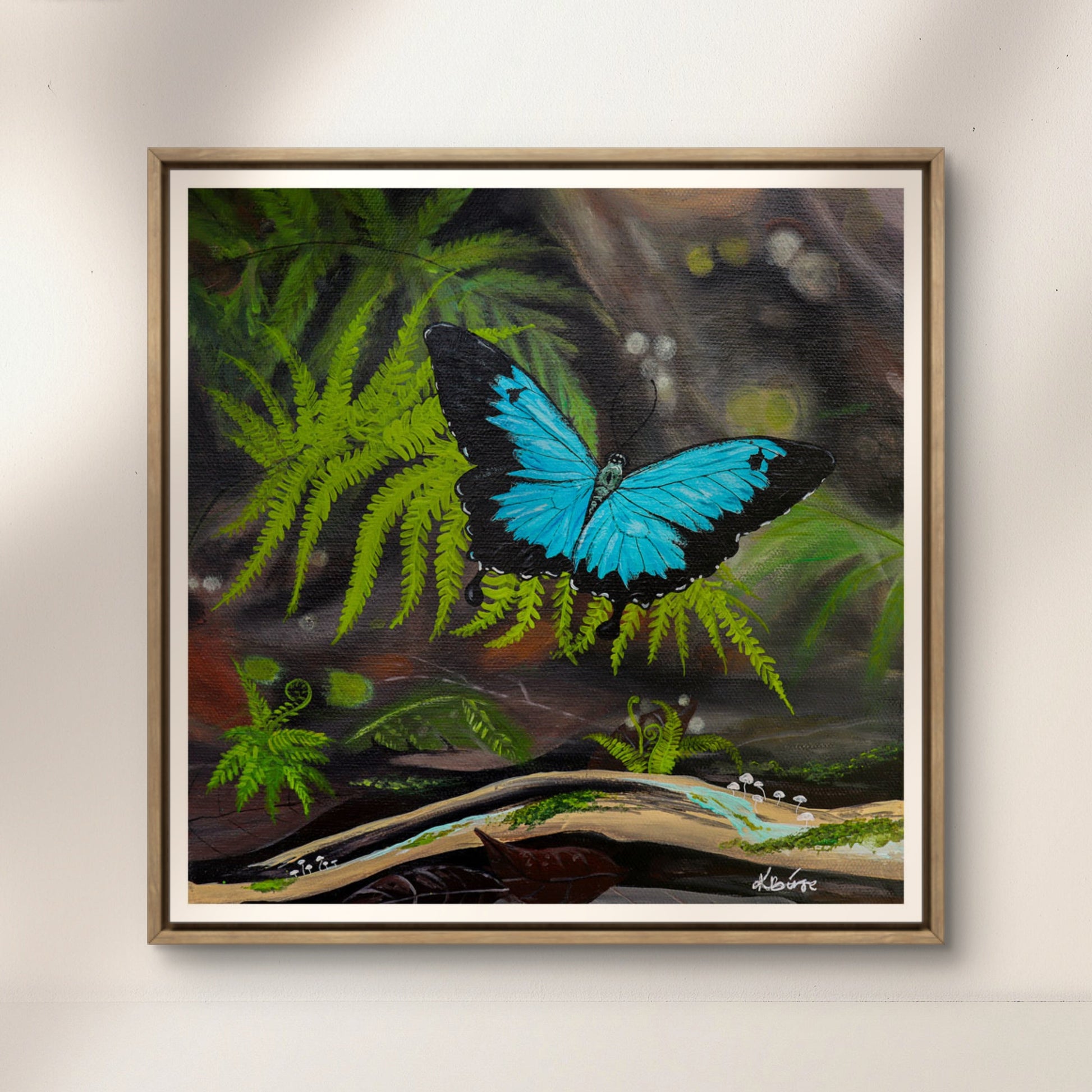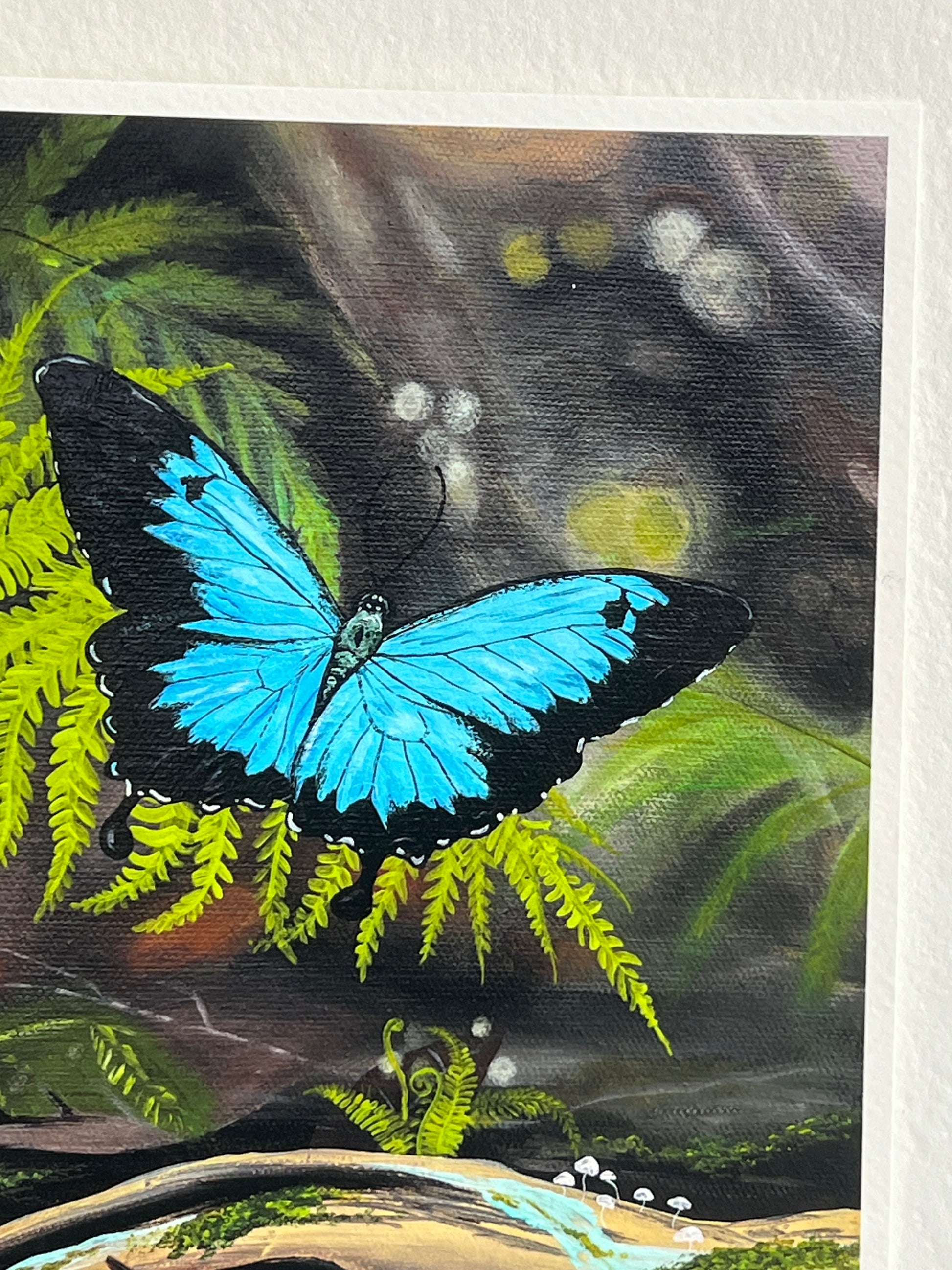 This painting captures that fleeting magic — the kind you only see when you’re really present. The stillness of the forest floor, the rush of water over stone, and the sudden flutter of life in the form of a Ulysses butterfly.
